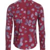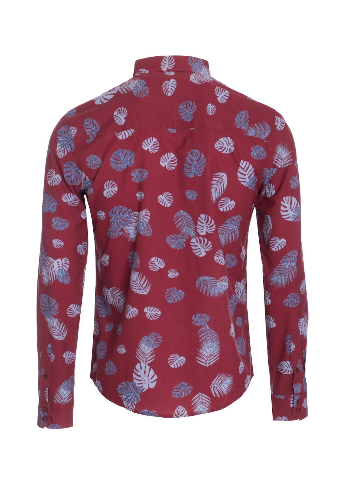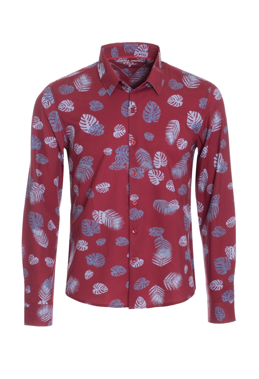 New Men’s Caviar Dremes Slim Fit Long Sleeve Button Down Dress Shirt Silky Iron-Free Wine With White and Blue Leaf Pattern