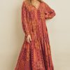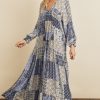 This paisley patchwork print maxi dress is traced with flouncy ruffles at the cuffs, tiered hem and has elongated ties tipped with fringed tassels. The model is 5’9″ and wearing size Small.