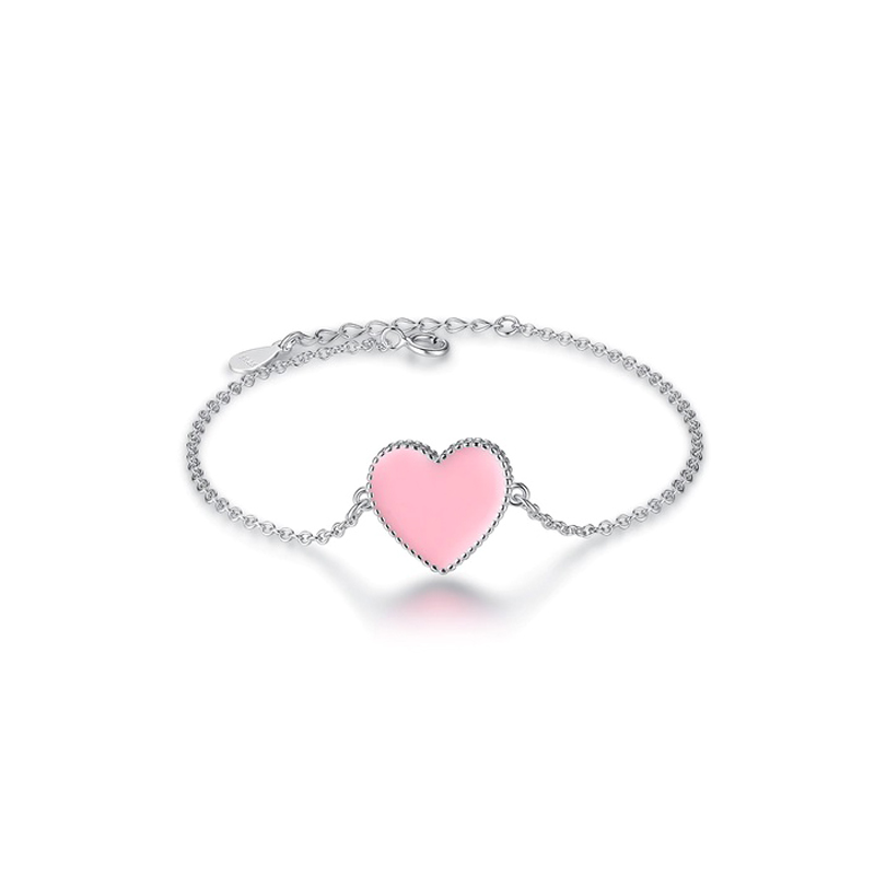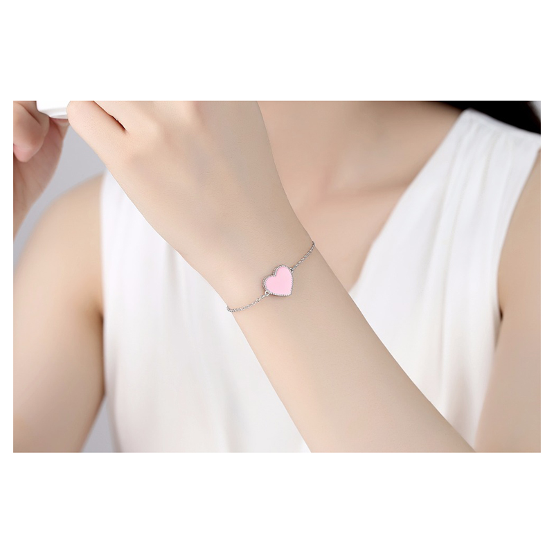 Cute Pink Heart Charm + 925 Sterling Silver Link Chain Bracelet.