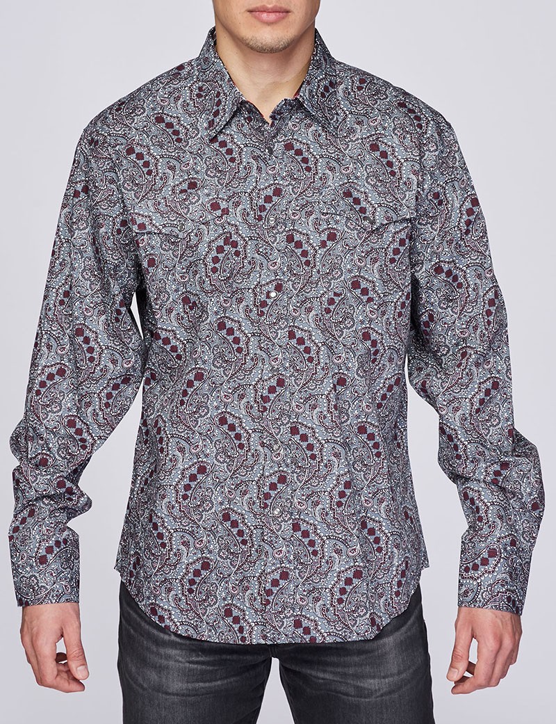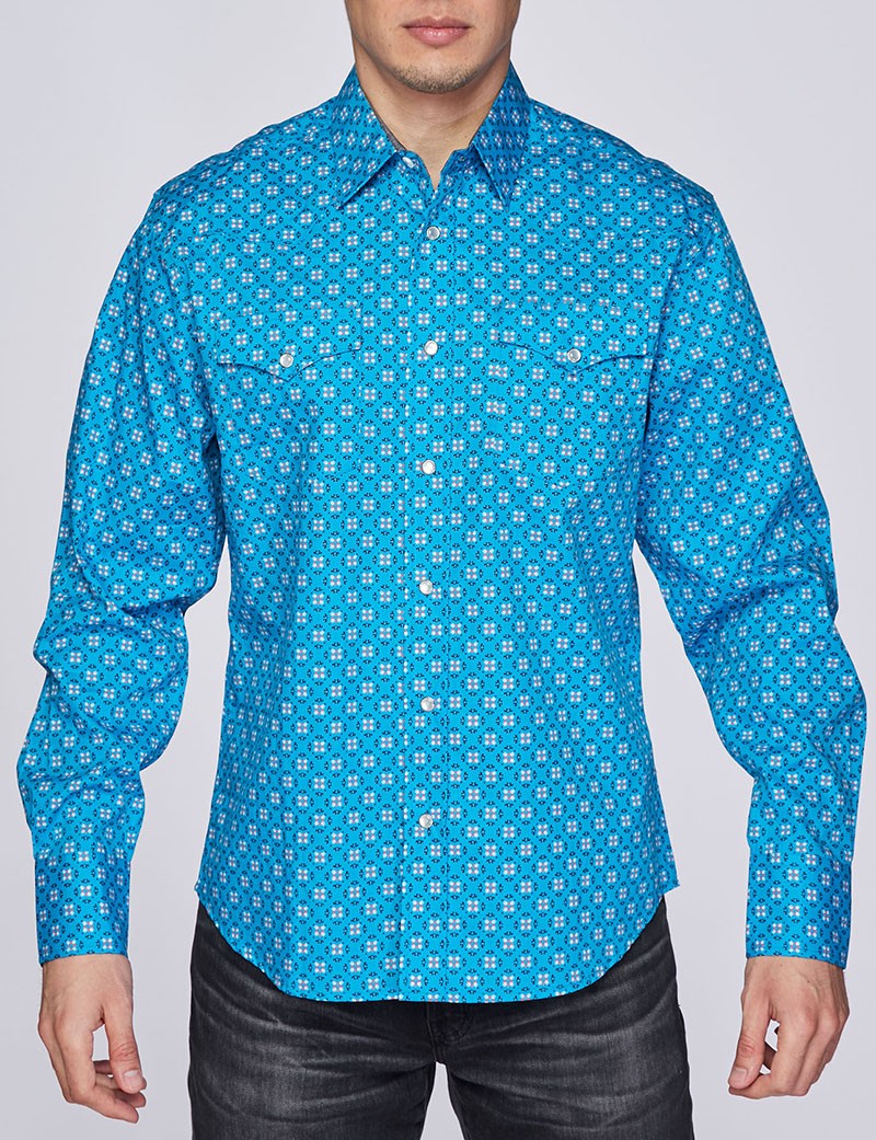 Men’s western long sleeve, printed shirts with snap buttons.