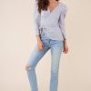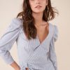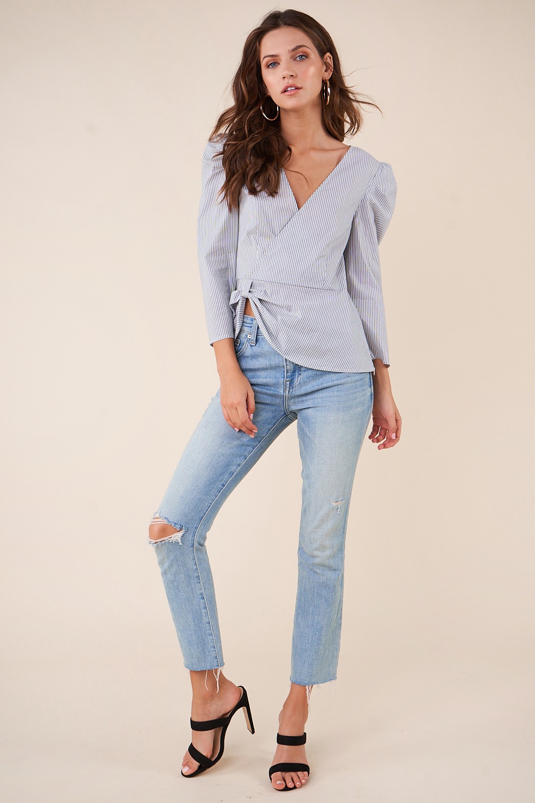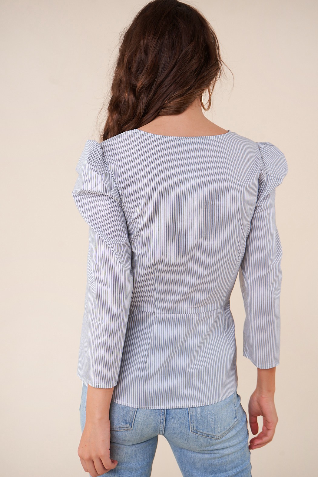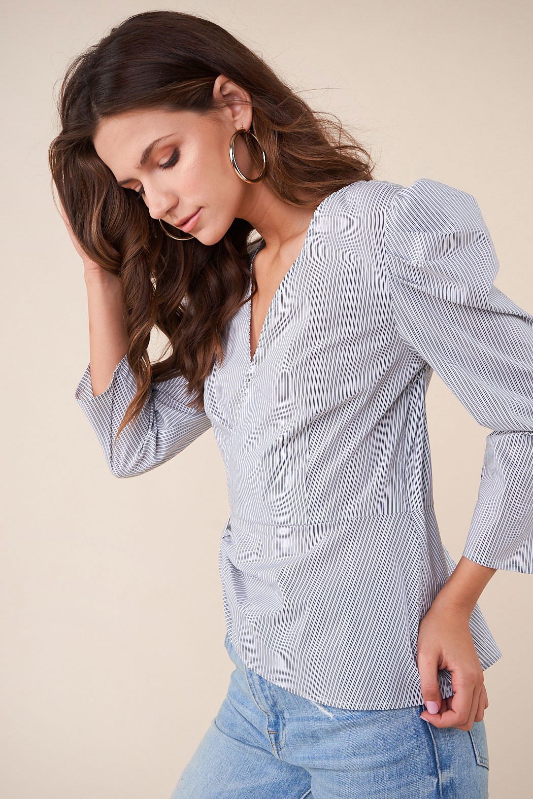 Black and white stripes decorate light and breezy woven fabric as it drapes into a plunging, surplice bodice, framed by long, puff sleeves. A twisted high-low cinched hem adds a casual-cool finishing touch. Pair with jeans, or dress it up with a skirt for a full look!